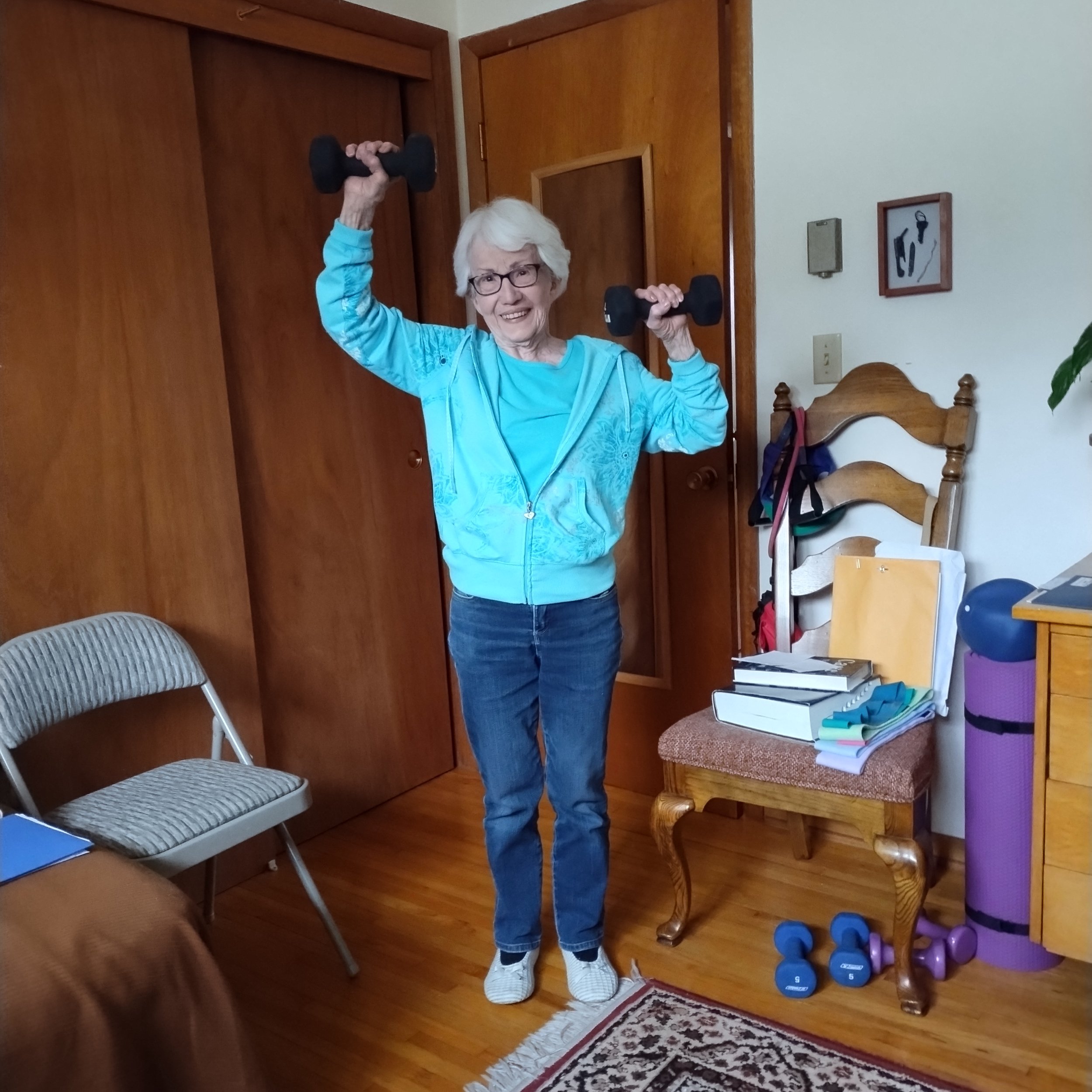 Although she likes to credit her “lucky genes” for her excellent health, I believe it also has to do with her dedication to her classes. Rarely does she miss one. When she and Don travel to their cabin in Colorado, she takes her weights, exercise bands, and balls. Even during COVID, Franny attended prerecorded classes through Vernon Communications and has continued online ever since. At this point, Franny could lead the class!
