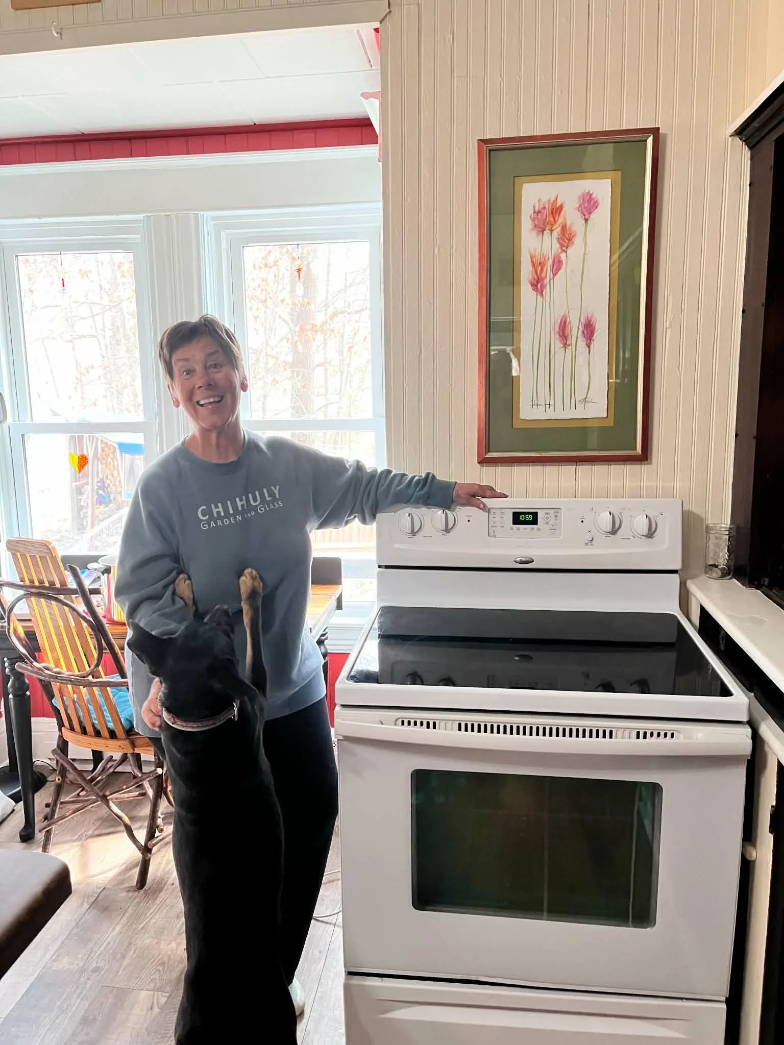 That is, until my friend Bonnie told me she had a friend who was getting a new stove and had a perfectly good, previously used one to get rid of! It just needed a new electrical plug, which I purchased at Nelson’s for twenty dollars. Bonnie, who has the skills of an electrician, hooked it up for me, and I’ve been hooting and hollering ever since.