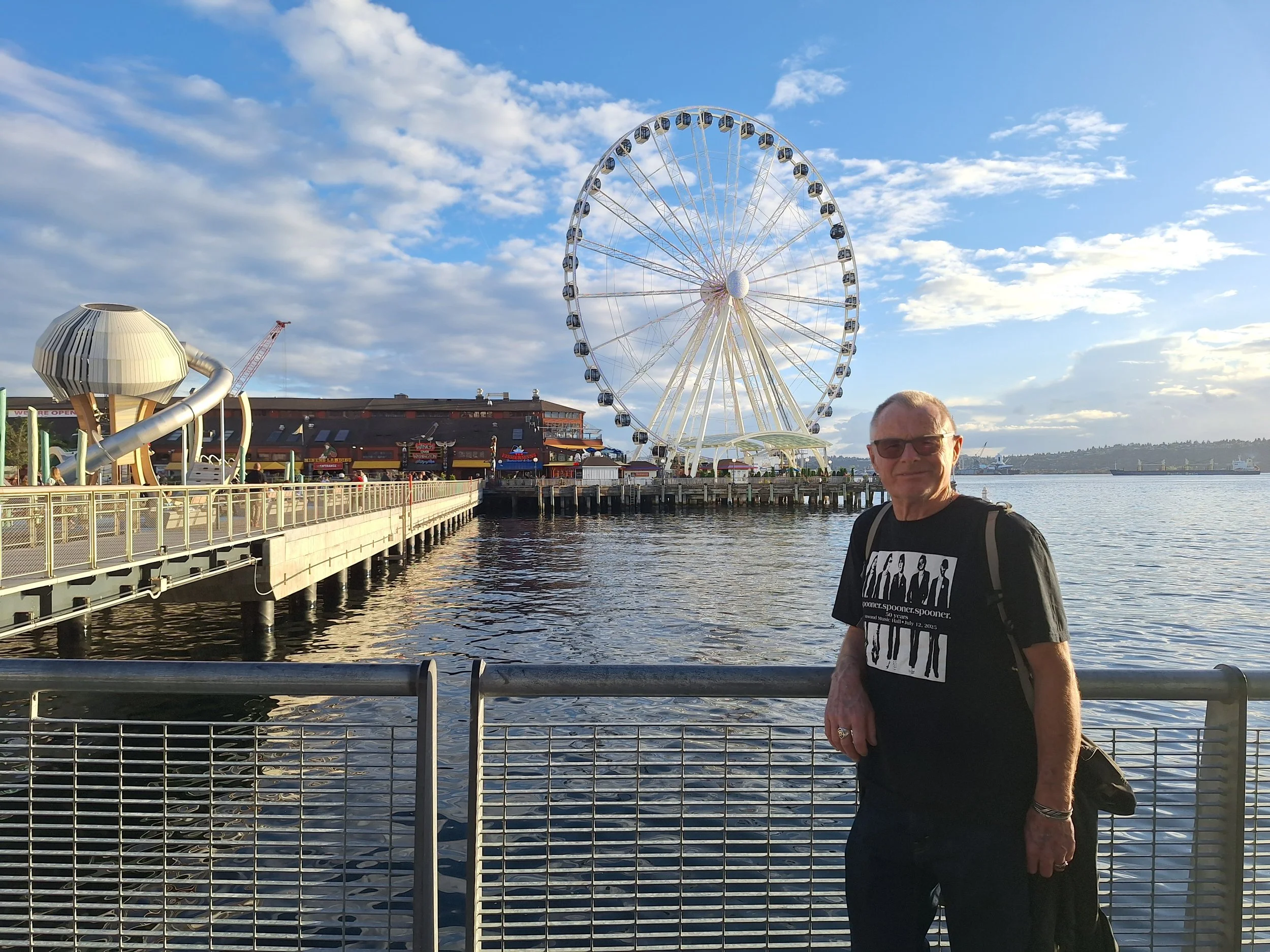 Holding hands, we stepped out jacketless into a glorious, sunshiny late afternoon. We headed toward Pike Place Market, where Dane bought a colorful shirt. We ate a late lunch/early dinner at a Thai restaurant; took in a tourist attraction called Wings Over Washington, highly recommended by the hotel staff; boarded the Bainbridge Island ferry to take in the sunset; and rode the famous Seattle Great Wheel.