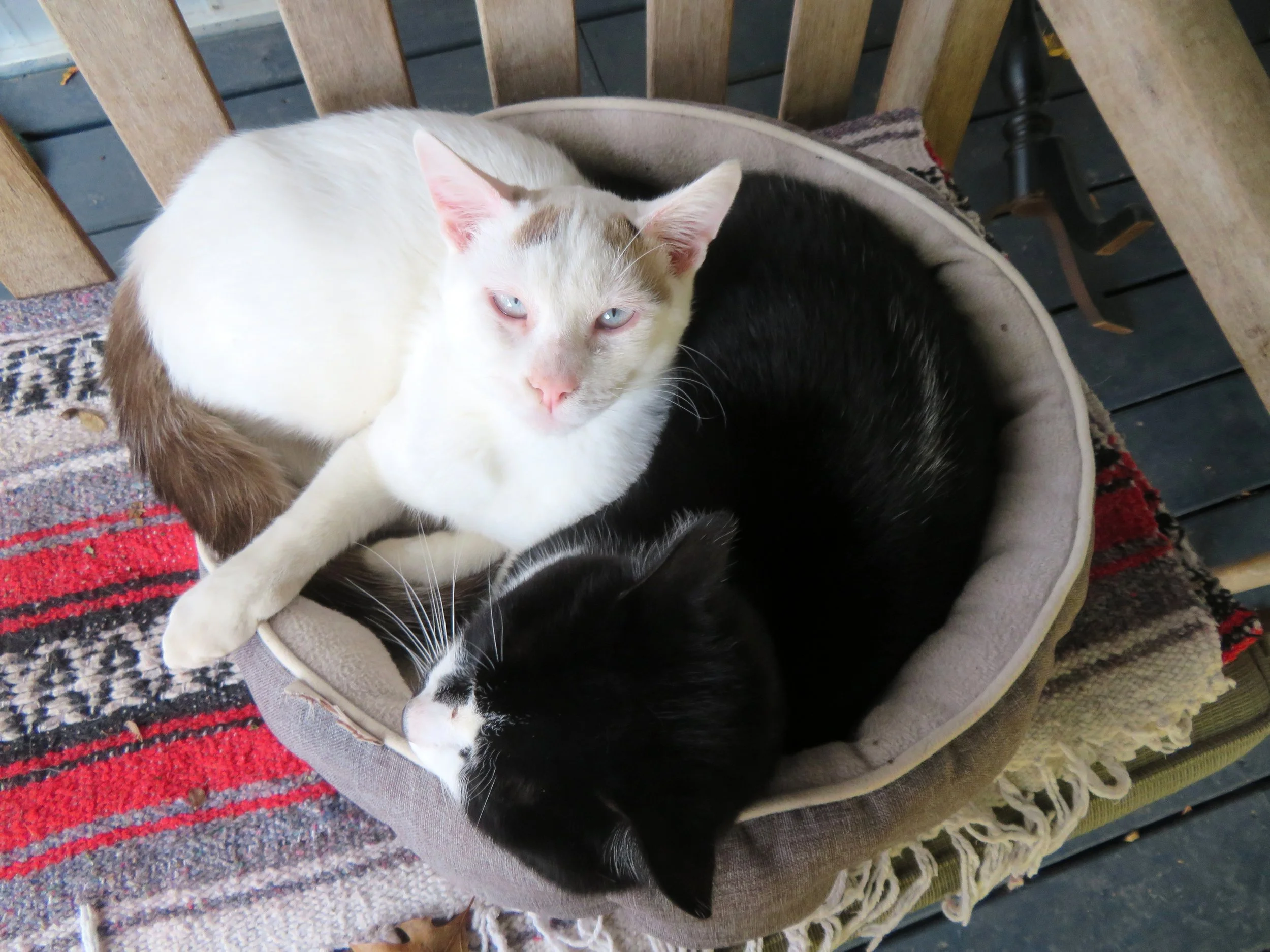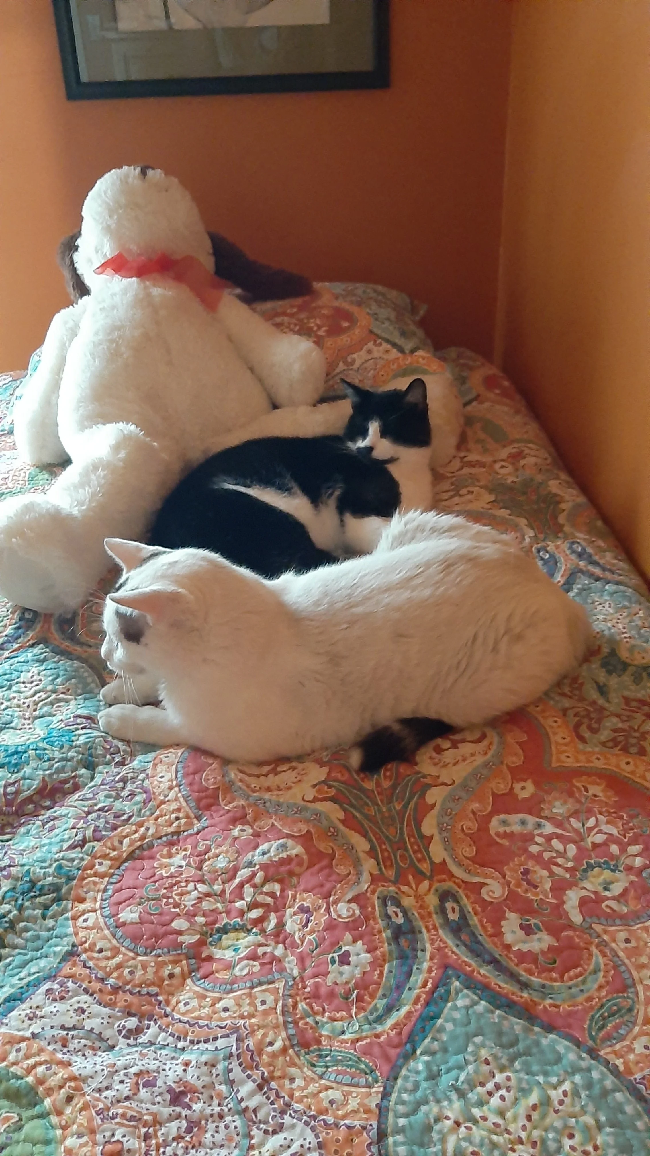 Watching Sal love up Rupert was soul-lifting. However, Merlin, who was a replacement kitty from the DHS after Ivan left this world, has become Sal’s closest friend and confidant. It’s not unusual to see Sal first wash each of Merlin’s gunky eyes (yes, they have been vet-checked), then lick the inside of each of his ears, and, exhausted (it must be hard work), spoon against Merlin and fall asleep. I never tire of the contrast: Merlin, seventeen pounds of unkempt white fluff (daily brushing required), and eight pounds of sleek, soft and shiny Salvador, with his clear green eyes.
