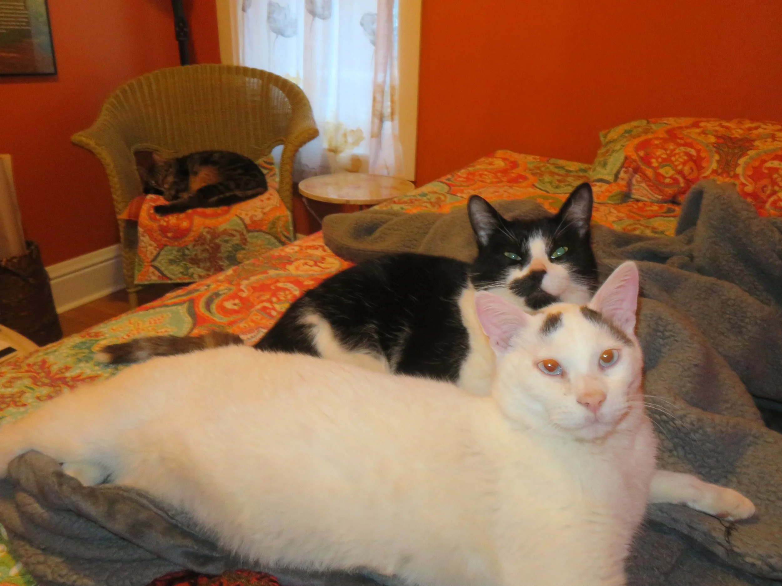 Besides “lover boy,” we also refer to Sal as our “stowaway cat” for his habit of hiding under the bed or in another secluded corner when the rest of the cats go in and out. Sal’s preference is to stay inside and greet each cat as they come and go, with licks and an affectionate head rub. At bedtime, Sal emerges from his hiding place, hops up on the bed near my head, and rubs his soft fur on my cheek. Sal reminds me that love is love, no matter your species, size, or coloring.